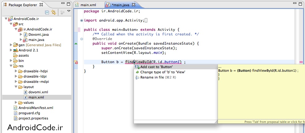 ۱۲.بعد از این کار، دوباره از برنامه خطا می گیره چون نوع دادهای که به عنوان خروجی متد (تابع) findViewById هست (یعنی نوع دادهای view) با نوع دادهای دکمه فرق میکنه به همین خاطر باید cast [به معنی در قالب قرار دادن، به شکل درآوردن] بشه، با زدن ctr+1، بهمون پیشنهاد میده که این کارو انجام بدیم.