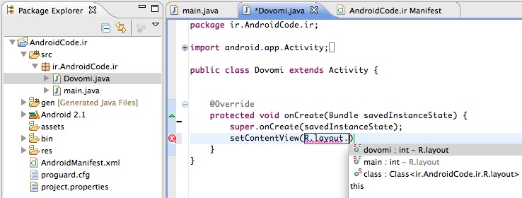 پس این کد رو اضافه میکنیم. (ورودی تابع : به قسمت منابع یا resource برو از پوشه ی layout فایل dovomi.xml رو بردار)