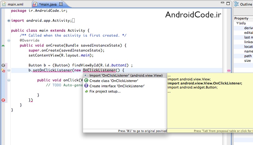 خوب بازهم خطا گرفته، ctrl+1 میزنیم ببنیم چه پیشنهادی میده، همون اولی یعنی وارد کردن کلاس onClickListener هست رو انتخاب میکنیم. در آخرین خط (بعد از بسته شدن پرانتز این دستور یه ; بذارید)