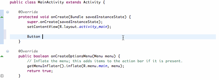 ۱۳.قدم بعدی اینه که متد setOnClickListener (به معنای گوش بزنگ کلیک) رو به کار ببریم تا هروقت کاربر روی دکمه کلیک کرد، بتونیم بهش پاسخ بدیم و باعث اجرای چیزی بشیم. برای این کار، باید این کد رو اضافه کنیم. () b.setOnCLickListener درون پرانتزها باید یه شی جدید از نوع onClickListener بسازیم. (یادتون باشه که میتونید برای راحتی کار و سرعت بیشتر چندتا حرف اول کلمات رو بنویسید و با زدن ctrl+space برنامه بقیه اش رو بهتون پیشنهاد میده). این شی درواقع یه کنترل کنندهی وقایع (event handler) ناشناس هست.