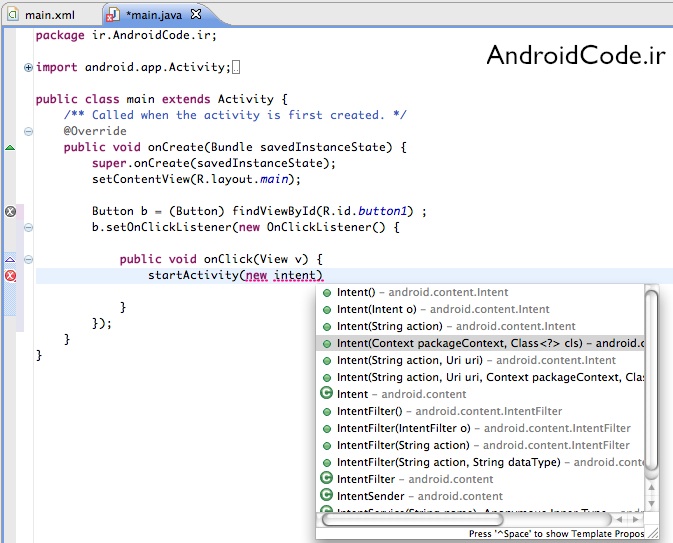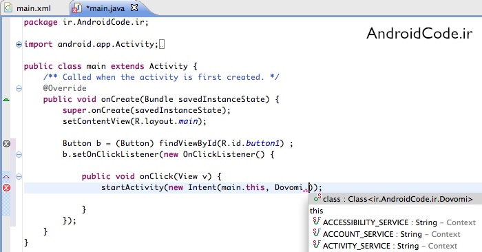 ۱۴.اونحایی که نوشته TODO // دستوراتی رو می نویسیم که میخوایم با فشردن دکمه اجرا بشن. خوب ما در اینجا میخوایم وقتی کاربر دکمه رو فشار داد، فعالیت Dovomi اجرا بشه. برای شروع کار یه فعالیت، از متد startActivity استفاده میکنیم. در داخل پرانتزهای این متد(تابع)، باید نمونهای از کلاس intent رو انتقال بدیم (پاس کنیم). -بعدا مفصل به کلاس intent میپردازیم- ولی تا همین حد بدونید که کار این کلاس اینه که اعلام کنه، این مولفه رو می خوام فعال کنم. برای این کار باید یه شی جدید از نوع intent بسازیم (new intent) برای ساختن این شی چندین راه مختلف وجود داره، و چون ما میخوایم برای یه فعالیت ازش استفاده کنیم ازاین نوعش استفاده میکنیم (تو تصویر مشخصه) که یه contexView میگیره و یه کلاسی که مال فعالیت مورد نظرمون هست.
