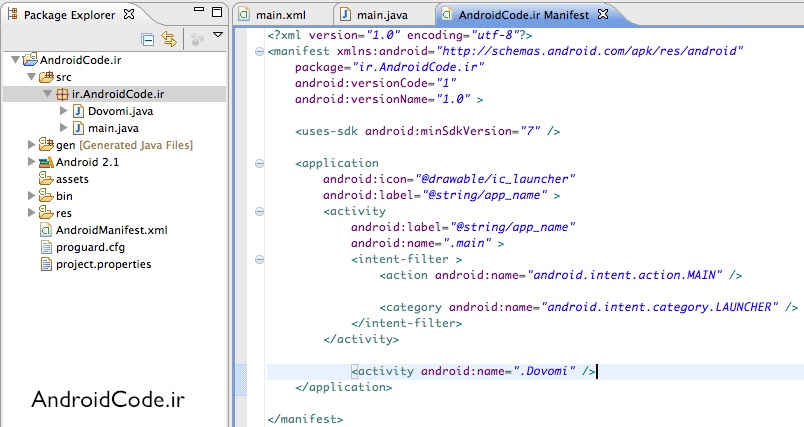 ۱۹.هر فعالیتی که در برنامه شما وجود داره، باید تو فایل manifest تعریف شده باشه، خوب پس الان باید تو فایل manifest یه فعالیت جدید درست کنیم، با نوشتن این کد