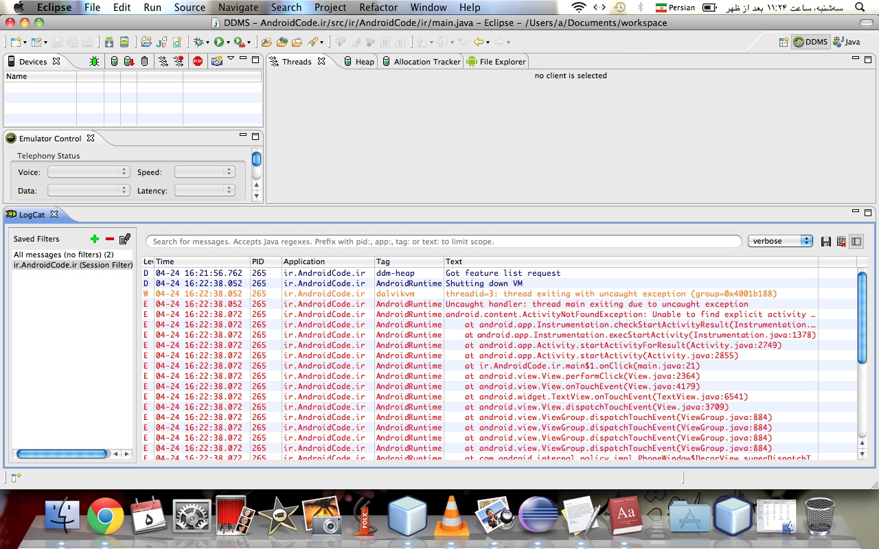 ۱۸.یکی از فضاهای مفید LogCat هست، وقتی برنامتون روی شبیهساز یا گوشی اجرا میشه، به طور مداوم پیغامهایی رو دربارهی چیزها میفرسته، همونطور که مشاهده میکنید یه سری پیغام قرمز رنگ هم داریم که به طور کلی چیز خوبی نیست.