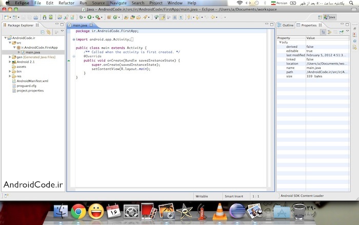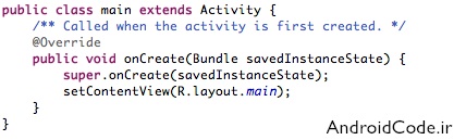 ۶.override کردن تابع onCreate ضروریه و می بینید که اول دستور super.onCreate رو فراخوانی می کنه بعد هم با دستور setContentView محتواش رو روی صفحه بندی (layout) این activity تنظیم می کنه. (با ارجاع به فایل xml ای که در شماره بعد توضیح داده شده) تا وقتی که ContentView تنظیم یا ست نشده باشه ما در خروجی چیزی نمی بینیم.