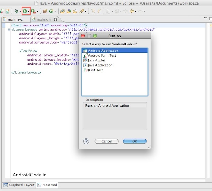 ۹. خوب حالا برای اجرای نرم افزار روی دکمهی Run بالای صفحه کلیک کنید (توی تصویر مشخصه). و چون اولین باره که می خواید پروژه های اندرویدی رو اجرا کنید ازتون می پرسه چه مدلی قصد دارید اجراش کنید، همون اولین گزینه یعنی Android Application رو انتخاب کنید و OK رو بزنید.
