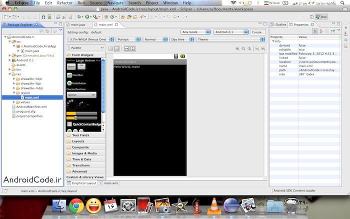 ۷.اون R.layout.main به فایل xml ای ارجاع داده میشه به نام main. این فایل xml در زیرشاخه res و بعد هم layout قرار داره. (بقیه زیر شاخه ها رو تو شمارهی ۱۳ آموزش خواهیم داد) که اگه روش کلیک کنید براتون یه صفحه ای رو میاره که توش واسط کاربری (UI) برنامه تون رو میتونید درست کنید.