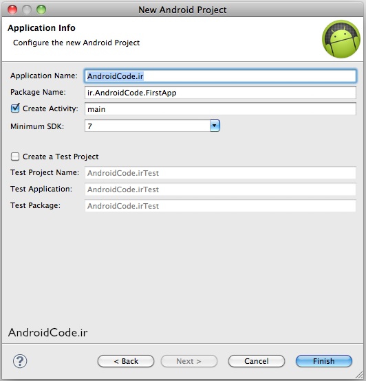 ۴.Application Name همون اسم واقعی برنامه است که توی گوشی دیده میشه. اسم برنامتون رو انتخاب کنید. package name معمولا برعکس دومین سازندهی برنامه است. گزینهی بعدی یه فعالیت (activity) میسازه. و مشخصه که هر برنامه ای حداقل باید یه صفحه داشته باشه که همون فعالیته. پس گزینهی Create Activity رو بزنید و یه اسم براش انتخاب کنید. چون این اولین صفحه ایه که کاربر از برنامه شما می بینه بهتره اسمش رو main بذارید. (حالا خیلی هم مهم نیست بعدا می تونید تغییرش بدید).