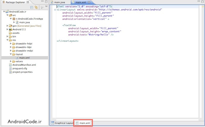 ۸.اگه از قسمت پایینی همین صفحه main.xml رو انتخاب کنید، کد xml نوشته شده برای نمایش این activity رو بهتون نشون میده. همون طور که می بینید این activity روی یک linearlayout سوار شده (خط ۲ کد) و یک TextView هم که به صورت پیش فرض روی صفحه بود اینجا ساخته و مقدار دهی شده. (خط ۷ کد). در پست های بعدی این قسمت بیشتر توضیح داده خواهد شد.