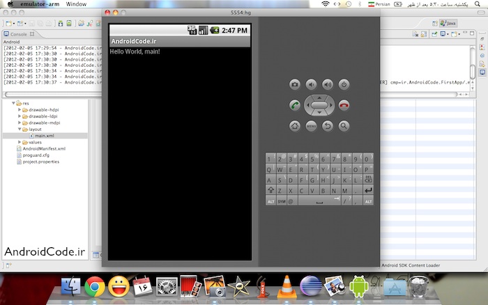 ۱۰.حالا شبیه ساز (emulator) شروع به شبیه سازی این برنامه می کنه یعنی اول برنامه رو روی دستگاه مجازی نصب می کنه و بعد هم اون رو اجرا می کنه، که یه هم چین چیزی می شه :