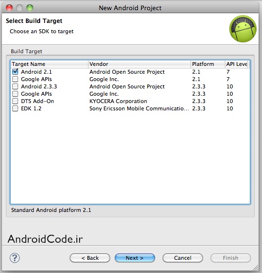 ۳.در این قسمت باید نسخهی اس دی کی مورد نظرتون رو انتخاب کنید. برای این کار پیشنهاد میشه کمترین API levelای که برنامتون میتونه باهاش کار کنه رو انتخاب کنید، مثلا اگه از هیچ ویژگی خاص جینجربرد استفاده نمی کنید، معقول تره که نسخه های پایین تری ازش رو انتخاب کنید تا کاربرانی که نسخه های پایین تری دارند هم بتونن از برنامتون استفاده کنن. next رو بزنید.