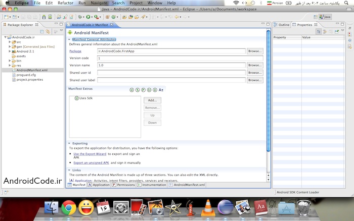 ۱۴. فایل بعدی AndroidManifest.xml هست که توی پست بعدی مفصل دربارش توضیح خواهیم داد. در واقع این فایل یک ویرایشگر بصریه (Visual Editor) که قسمت های مختلف نرم افزار رو می تونیم توش تغییر بدیم. در واقع این فایل برنامه شما رو برای سیستم اندروید تعریف و تشریح می کنه.