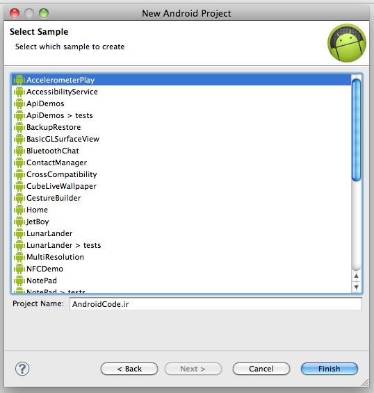 ولی اگه بخواید پروژتون رو بر پایهی نمونه هایی که خود گوگل ارائه میده بنا کنید، گزینه create project from existing sample رو فعال کنید، next رو بزنید و API Level رو انتخاب کنید. دوباره next رو بزنید و از بین نمونه های موجود، انتخاب کنید.
