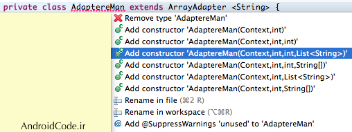 حالا باید برای این فهرست سفارشیمون خودمون کلاس وفقدهنده (Adapter) بسازیم. پس کلمه ArrayAdapter رو به AdaptereMan تغییر میدیم (میدونم که هنوز کلاسشو نساختیم). حالا زیر کلمه AdaptereMan خط قرمز میکشه و وقتی ctrl+1 رو بزنید بهتون پیشنهاد میده که اون کلاس رو بسازید، ولی ما خودمون می خوایم اون کلاس رو بسازیم. اما همین کد قبلی رو یه تغییر دیگه هم باید بدیم و اون اینه که یه ورودی دیگه قبل از getResources اضافه کنیم و اون هم شناسه (Id) اون نمایمتنی هست که قراره نوشتههای هر ردیف درونش قرار بگیره. پس کد اینطوری میشه: