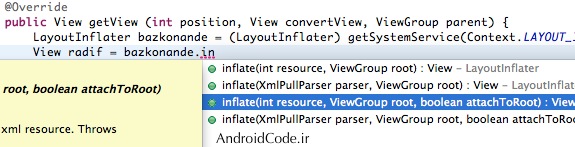 ۸.تابع getView برای هر ردیف از فهرست صدا زده میشه. و زمانی که صدا زده بشه ما این انتخاب رو داریم که برای هر ردیف در فهرستمون چه چیزی رو نشون بدیم. در این مثال ما میخوایم این تابع رو تغییر بدیم تا در کنار نام هر دانشگاه، نشان مربوط به همون دانشگاه قرار بگیره. باید به اون نمایتصویر و نمای متنی یه طوری دسترسی پیدا کنیم و راهش اینه که از کلاس بازکنندهصفحهبندی (LayoutInflater) یه نمونه بگیریم و به عنوان ورودی بهش اون صفحهبندی که برای هر ردیف فهرست درست کردیم رو بدیم تا برامون بازش کنه و بتونیم تغییرش بدیم. پس اون خط توضیحات (comment) رو از کد بالا پاک می کنیم و به جاش مینویسیم LayoutInflater bazkonande = حالا باید از یکی از خدمات سیستمی اندروید استفاده کنیم، به نام Context.LAYOUT_INFLATER_SERVICE.
