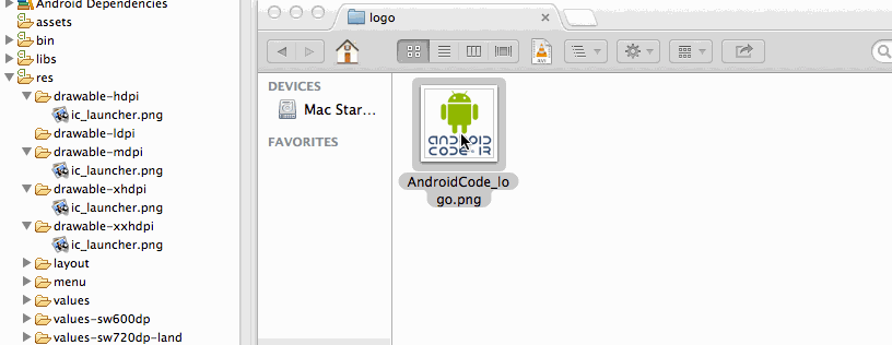 اگر نمایههای ابعاد مختلفی که برای برنامهتون تهیه کردید فرقی نمیکنه، (مثلا بعضیها برای اندازههای بزرگتر جزئیات بیشتری تو تصویرشون میذارن و تو اندازههای کوچکتر جزئیات رو کمتر میکنن تا خواناتر بشه) میتونید تو این مرحله، بزرگترین اندازه نمایهای که درست کرید رو بهش بدید، خودش بقیه اندازهها رو براتون میسازه. اگر بخواید مثلا فقط mdpi رو تغییر بدید میتونید به پوشهاش برید و اونو تغییر بدید، به این صورت که فایل رو بکشید و بندازید توش، اینطوری: