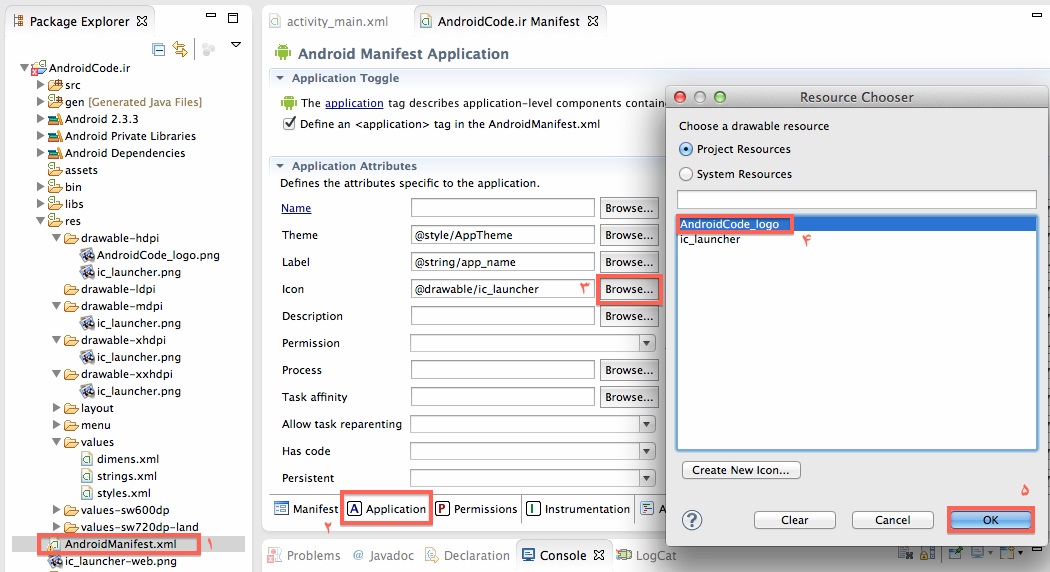 ۶.اندروید خودش پیشنهاد میکنه که اسم تصویر مربوط به نمایهی برنامه رو ic_launcher بذارید اما اگه میخواید یه اسم دیگه بذارید، باید فایل AndroidManifest.xml رو باز کنید، به زبانه application برید و روی دکمه Browse جلوی icon بزنید. (مراحل توی تصویر هست)