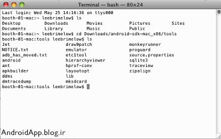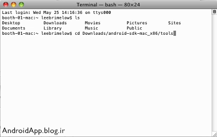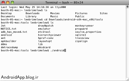 ۶.دستور cd Downloads/android-sdk-mac/tools (این دستور یعنی به فولدر downloads برو بعد android-sdk-mac-x86 بعد هم tools اگه جای دیگه ای ذخیره کردین آدرس همون جا رو بدید)