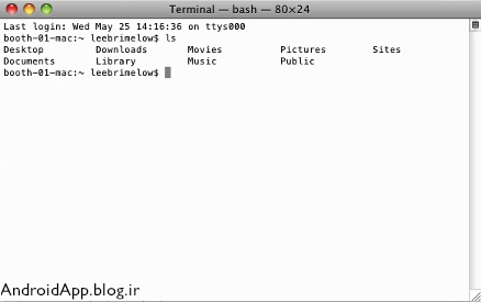 ۵.ترمینال که باز شد بنویسید ls تا لیست فایل هایی که در روت root (ریشه) هستند رو نشون بده (می خوایم به فولدر tools در android-sdk-manager-mac_xxx بریم)