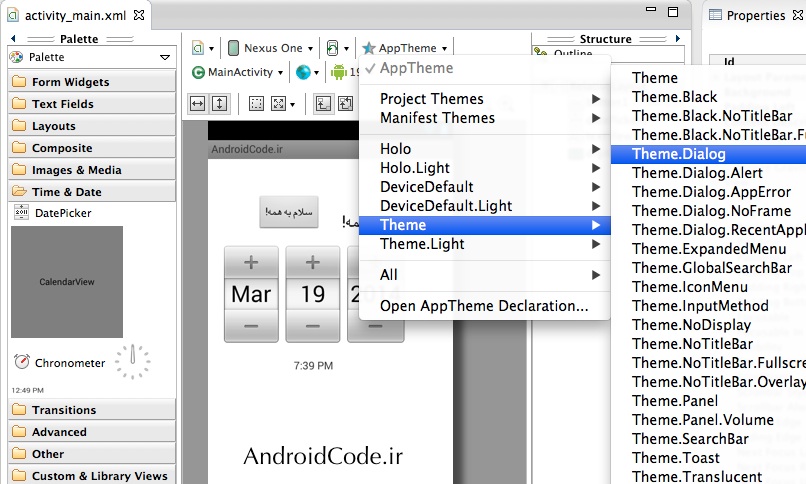۱. یه پروژه جدید بسازید و فایل activity_main.xml (در زیرشاخه res->layout) رو باز کنید، (اگر همین الان پروژه رو ساختید خودش این فایل رو براتون باز می کنه). از ستون سمت چپ چند تا شی بندازید تو صفحه (تا وقتی قالب رو عوض میکنید متوجه تغییرات بشید). اندروید خودش به صورت پیشفرض، یک عالمه قالب مختلف برای صفحات فعالیت و پروژه داره، از منوی بالا اونجا که نوشته app theme کلیک کنید، یه فهرست براتون باز میشه که قالبها رو دستهبندی کرده، میتونید هر کدوم از قالبها رو امتحان کنید و تاثیرش رو روی صفحهتون ببینید.