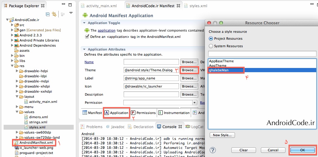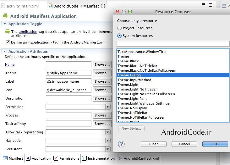 ۲. اگر قالبی رو همونطور که تو مرحلهی قبل گفته شد انتخاب کنید، در واقع به برنامهی شما اعمال نمیشه، برای اینکه قالب برنامهتون رو تغییر بدید باید AndroidManifest.xml رو باز کنید و به زبانه Application برید. جایی که نوشته Theme جلوش دکمه Browse رو بزنید و بعد هم از بالاش دکمه System Resources و قالب مورد نظرتونو انتخاب کنید.
