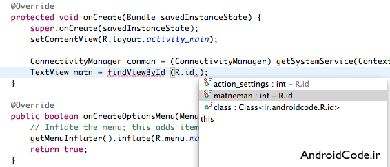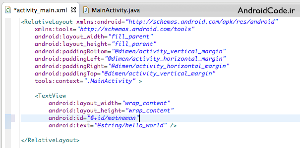 نحوه تعریف کردن شناسه اینطوره که در فایل activity_main.xml، در تگ TextView مینویسیم "android:id="@id/matneman و چون این اولین باره که این شناسه رو تعریف می کنیم، یه علامت مثبت (+) هم کنار کلمه id می نویسیم، یعنی اینطوری:
