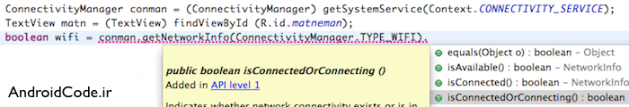 ۵. اطلاعات مربوط به وضعیت wifi رو تو یه متغیر boolan به نام wifi میریزیم. برای همین از کلاس ConnectivityManager استفاده میکنیم. تابع getNetworkInfo اطلاعاتی که بخوایم رو از شبکه میگیره. حالا برای ورودی این تابع باید اون اطلاعاتی که احتیاج داریم رو بدیم، ما الان به اطلاعات wifi احتیاج داریم پس ConnectivityManager.TYPE_WIFI رو به عنوان ورودی وارد میکنیم. چون در آخر نیاز به خروجی از نوع boolean (درست یا نادرست) داریم از تابع isConnectedOrConnecting استفاده میکنیم.