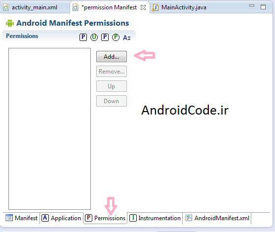8. این اجازه رو باید تو فایل AndroidManifest.xml ثبت کنیم. پس Manifest رو باز میکنیم، داخلش زبانه ی permission دیده میشه.