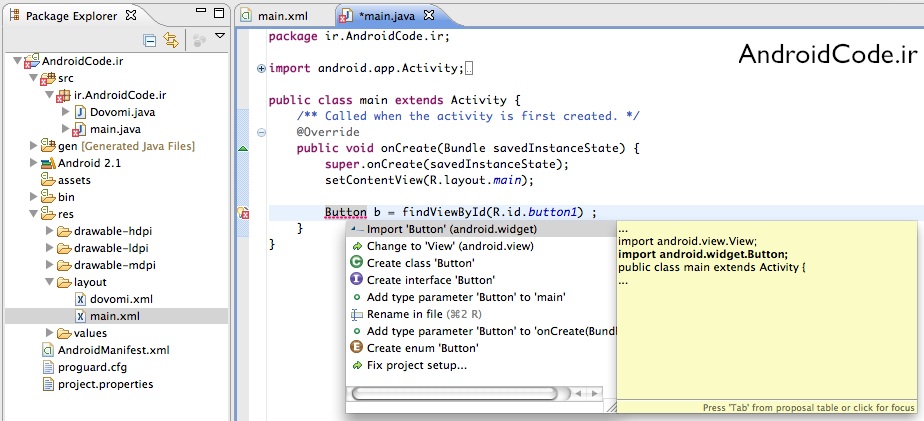 ۱۱.با زدن کلیدهای ctrl+1 در ویندوز و cmd+1 در مک، می‌بینیم که از برنامه خطا می‌گیره و برای رفع مشکل پیشنهادهایی رو می‌ده، اینجا بهتره با انتخاب گزینه 'import 'Button کلاس دکمه رو وارد(import) می‌کنیم.