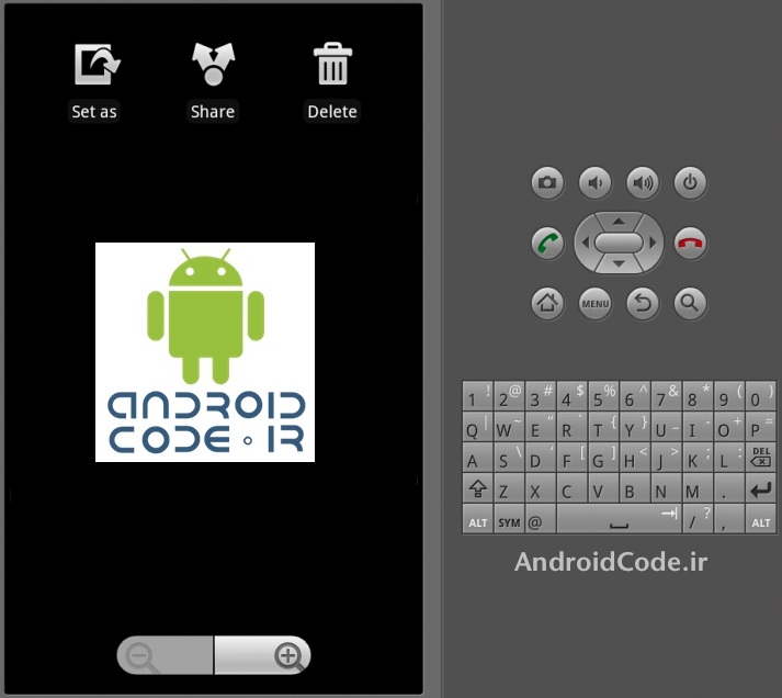 ۱.شبیه ساز رو اجرا می کنم و برنامه‌ی Gallery رو از تو منوی برنامه‌ها اجرا می‌کنم و یه عکس از توش انتخاب می‌کنم، می‌بینید که بالای عکس یه دکمه share (به‌اشتراک‌گذاری) وجود داره. این دکمه بهتون اجازه می‌ده که این عکس رو برای یکی دیگه بفرستید، اما ممکنه یه عالمه برنامه تو گوشیتون داشته باشید که قادر به انجام این کار باشن. مثل ایمیل یا بلوتوث و ... شما می‌تونید برنامه‌ی خودتون رو به این لیست برنامه‌ها که می‌تونن عکس رو به اشتراک بذارن اضافه کنید و این دقیقا کاریه که یه مفهوم ضمنی (implicit intent) انجام می‌ده.