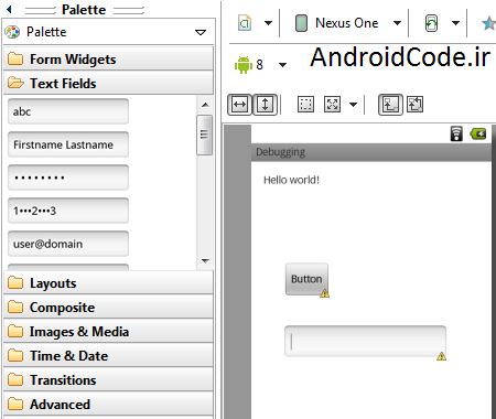 2. میریم سراغ فولدر res بعد layout ، فایل activity_main.xml رو باز می‌کنیم، از قسمت pallette یه TextViewو Button و EditText می‌کشیم میاریم رو صفحه. البته TextView معمولا به صورت پیش فرض هست(همون HelloWord).