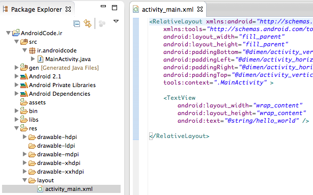 ۱.یه پروژه جدید در ایکلیپس بسازید و از فولدر res به زیر شاخه layout برید و activity_main.xml رو باز کنید. وقتی از منوی پایین روی activity_main.xml کلیک می‌کنیم و به کد مربوط به این فایل می‌ریم، می‌بینیم که در اولین خط نوع صفحه‌بندی تعیین شده.